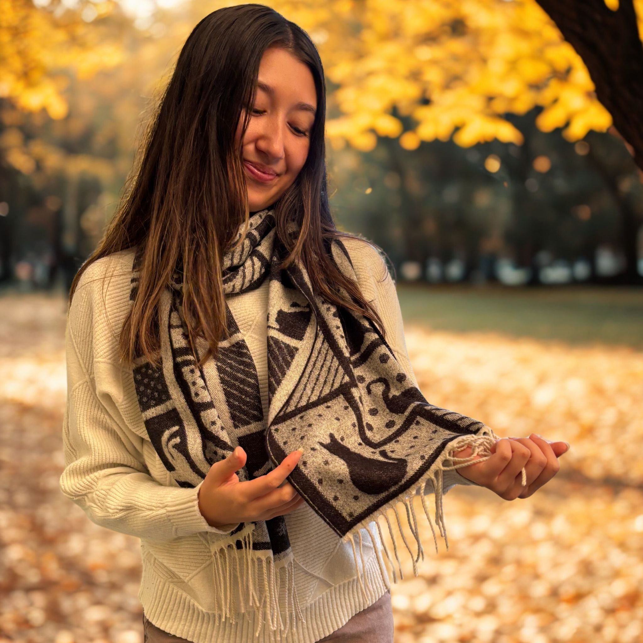 Stay comfortably warm with this charming scarf featuring playful cat patterns. Made in Japan, this cozy accessory is crafted with Amino Hot® yarn—a special fiber designed for gentle warmth and everyday comfort.