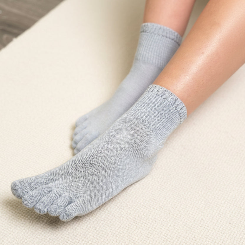 Made with 71% silk, these Silk Blend 5-Toe Quarter Socks are designed for breathable, skin-friendly comfort. The five-toe construction allows natural movement and helps reduce friction for all-day ease.