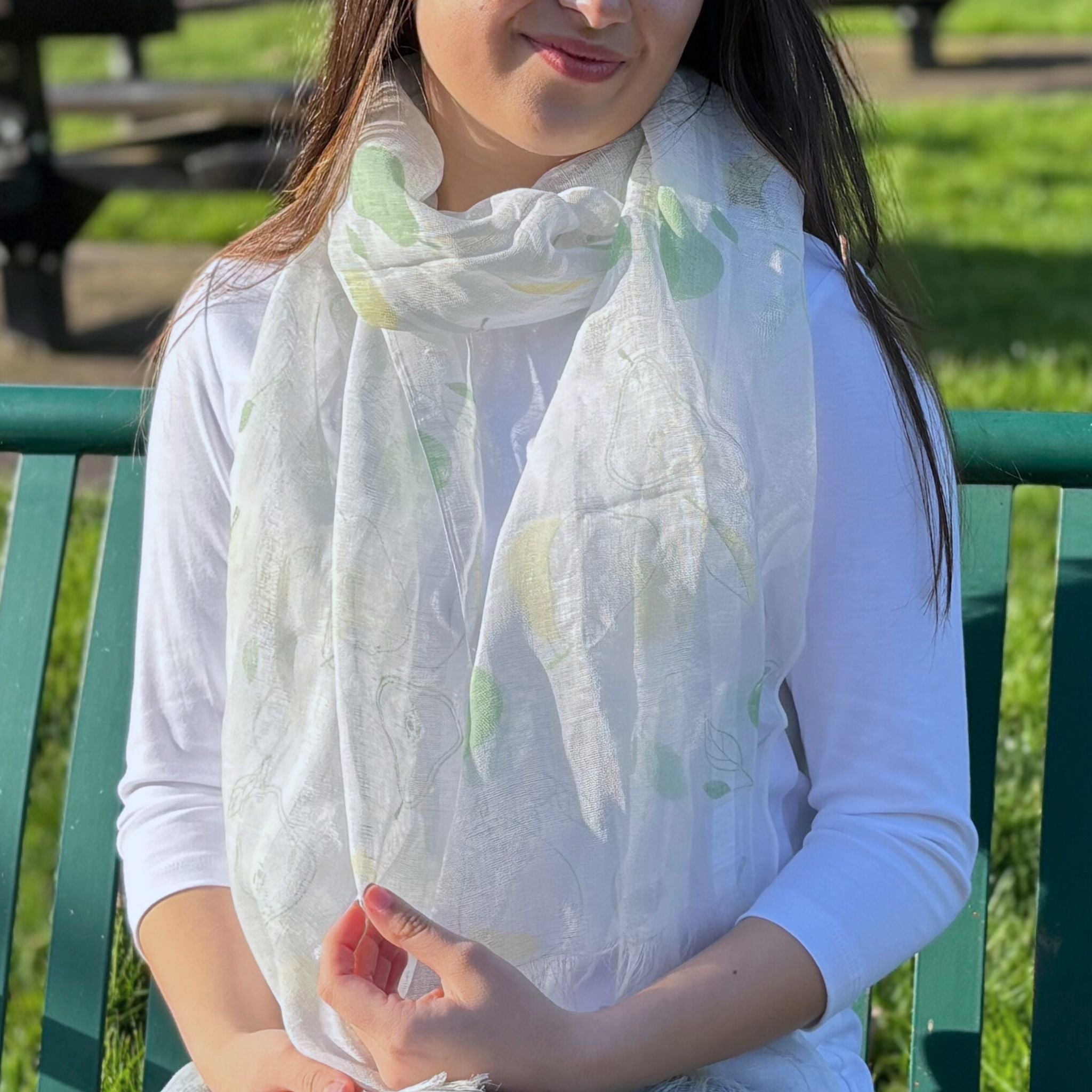 Bring a fresh and elegant feel to your look with this lightweight linen scarf, adorned with a charming pear pattern.