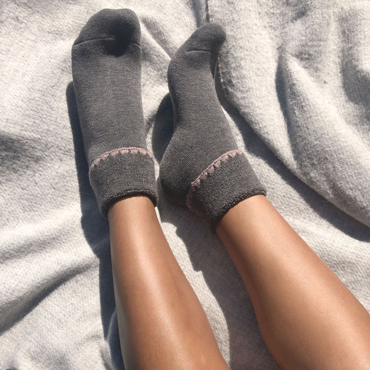 These unique socks have been widely embraced in the everyday life of Japan, especially during the chilly seasons. The somewhat nostalgic, comforting shape is very charming. Hand-crafted clamshell-like embroidery is gently applied to the opening of the socks. In the old days of Japan, when the feet were very cold and the rooms were not very warm, these socks were treasured for layering indoors over thin socks to keep the feet warm. These socks have existed in Japan for a long time, but their warmth and functionality have now been rediscovered, and they are now valued around the world as an alternative to slippers.